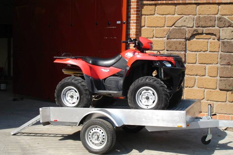 Remolques en aluminio con chasis un eje, rueda jocky, luces LED, rampas, redila fija de 12” de altura y argollas de amarre.